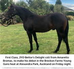 First Class, the 2YO Bettor's Delight colt from former Bromac Lodge mare Amaretto Bromac (Falcon Seelster-Arma Class), is ready to debut in the $25,000 Breckon Farms Young Guns Heat at Auckland on Friday after winning his organised workout at the same venue last Friday.